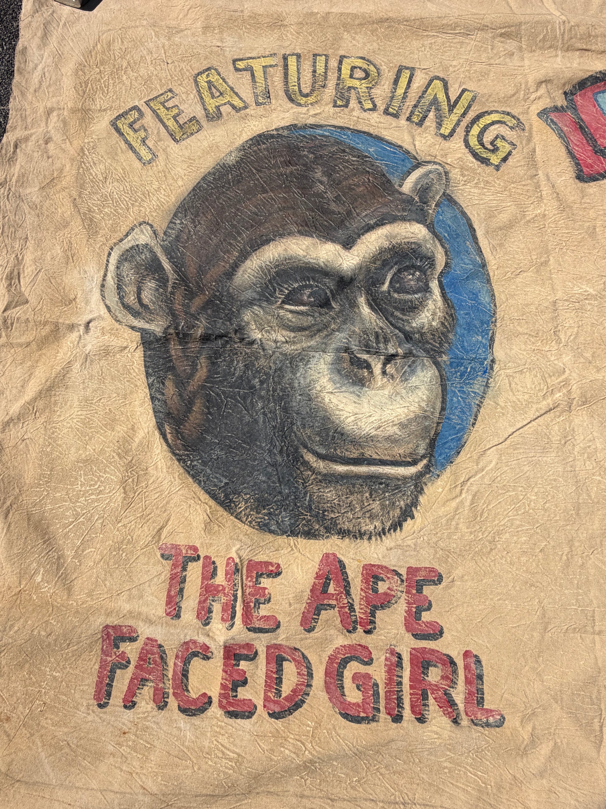 This is a production used circus banner from Doom Patrol starring Diane Guerrero, April Bowlby, Matt Bomer, Brendan Fraser and Timothy Dalton. This is hanging in the circus in season 2 episode 1. It is approximately 126" wide by 54" tall. It is hand painted cloth. It is made to look old but is in good condition relative to how it was on set. There are grommets in all 4 corners.